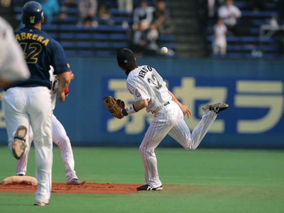 2番 根元 一ゴ 1-2から引っ張ったが、ファーストの正面・・・。さばいたカブレラがそのまま1塁へ。 |