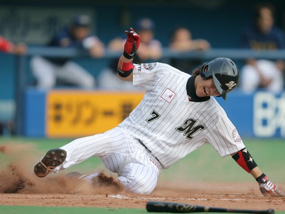 9番 金澤 二ゴ 初球を引っ張りきれなかったセカンド正面への当たり。4-6-3のダブルプレーを狙われたが、金澤が駆け抜け、1塁はセーフ! この間に3塁ランナー・ベニー、ホームイン!9対7。 ![]() 8