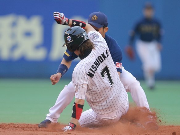 2番 根元 一ゴ 初球、1塁ランナー・西岡が走った!キャッチャー・日高の送球はワンバウンドとなり、際どいタイミングながらセーフ!盗塁成功! |