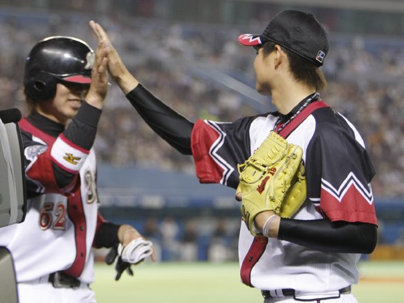 タイムリースリーベースを放った女房役・金澤が唐川とハイタッチ