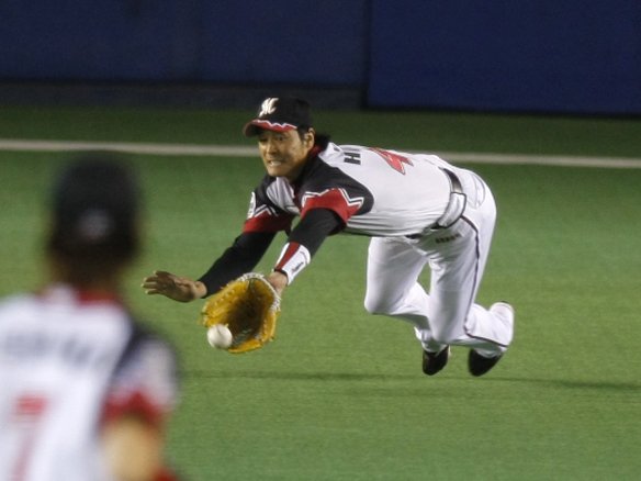 投手 荻野忠 8番 木村拓 右安 1-1から引っ張られた一二塁間への打球。ファースト・福浦が飛び込んだが、及ばず、ライト前へ抜けた・・・。 |