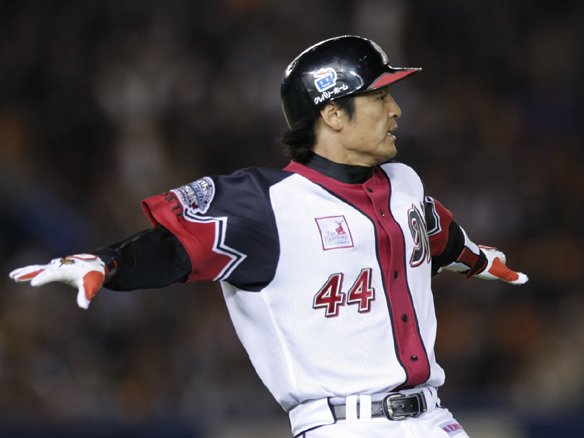 8番 オーティズ 左安 0-2から引っ張った打球はショートの頭上を越えた! 3塁ランナー・今江、同点のホームイン!!2対2。 ![]() 2