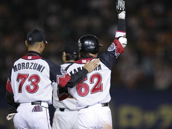9番 金澤 右中三 0-3からインコースやや低めの球を引きつけて弾き返し、右中間を破った!打球はそのままフェンスまで転がった! 2塁ランナー・オーティズ、悠々ホームイン!7対2! 金澤、これでデビューから9試合連続安打&プロ初3ベースヒット! ![]() 7
