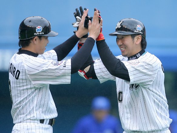 ライトへ3ランホームランを放った大松はサブローとハイタッチ