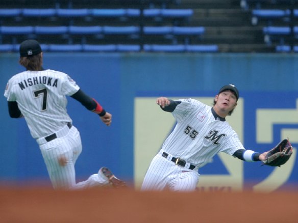 3番 里崎 中安 1-1から2塁ランナー・西岡が走った!キャッチャー・相川が3塁へ送球も逸れ、ボールはファールゾーンへ。 この間に西岡は一気にホームイン!1対0。 記録は三盗とキャッチャーのエラー。 |