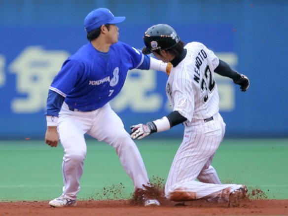 7番 ビグビー 遊併 1-1から打たせた二遊間寄りの打球。ショート・西岡が膝で抱えるようにして押さえ、2塁へトス、6-4-3のダブルプレー! |
