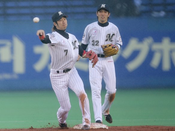 2番 仁志 遊併 1-0から引っ張り損ねた2塁ベース付近への打球。ショート・西岡がさばき、そのまま2塁を踏んで1塁へ送球。6-6-3のダブルプレー! |
