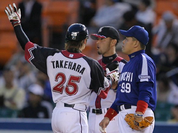 投手 小笠原 3番 里崎 遊ゴ 1-0からバットを折られ、ショートの正面へのボテボテのゴロ・・・。 |