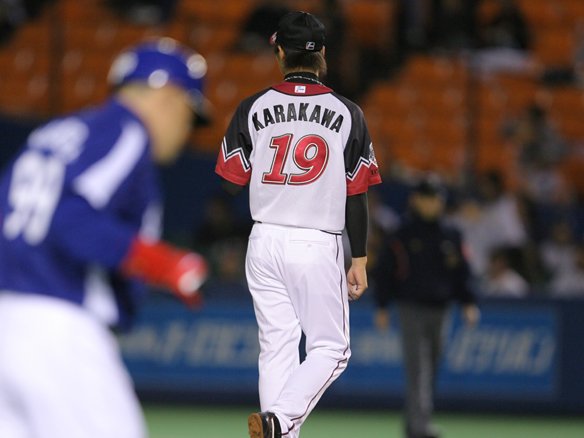 唐川、1死満塁のピンチを背負うと、和田の犠牲フライ、中村紀にホームランを許し、4点を献上してしまいました。 しかし、唐川が投げる日はよく打つ打線が取り返してくれるはず! |