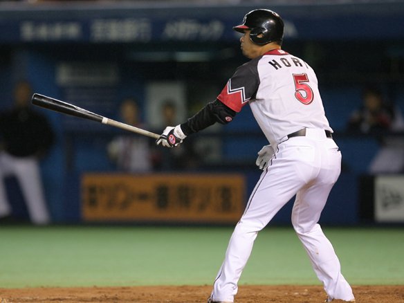 1番 西岡 右中二 0-1から押っつけた打球は右中間を真っ二つに割り、ワンバウンドでフェンスを直撃! |