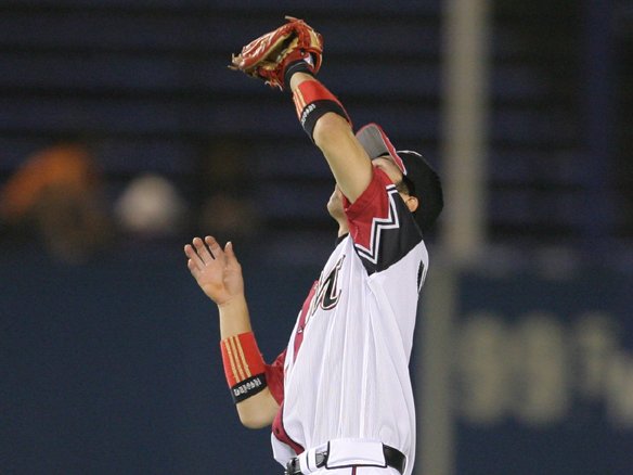 3番 里崎 左飛 前の堀から7球連続ボールで0-3となった後、1-3から振り抜いた左中間への打球。しかしレフト・和田のダイビングキャッチに阻まれてしまった・・・。 |