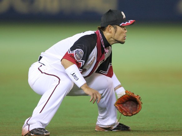 8番 デ ラ ロサ 遊ゴ失 1-1から打たせたショート正面への打球。西岡が捕球体勢に入ったが、手元でボールを弾いてしまい、エラー・・・。 |