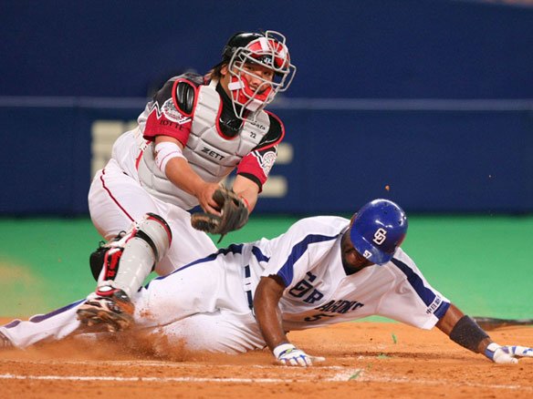 キャッチャー里崎の好ブロックで3塁走者・デラロサをタッチアウト!