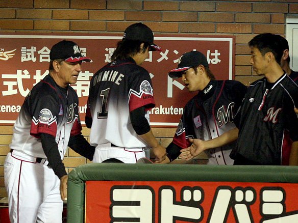 7回途中で惜しくも降板となった大嶺をバレンタイン監督が迎える