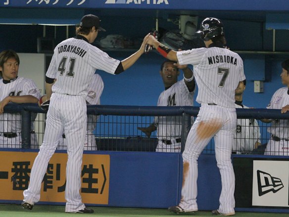西岡は福浦の犠飛で生還し、小林宏を援護