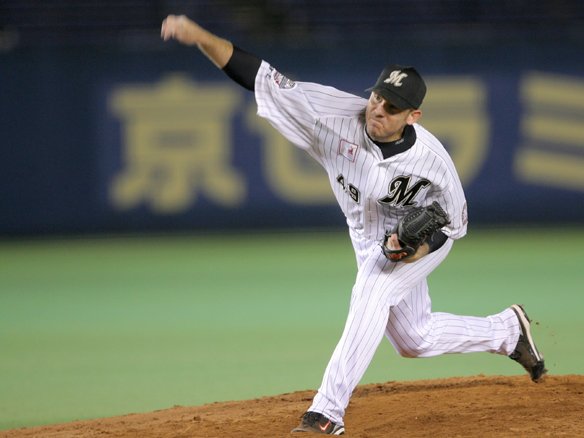 投手 シコースキー (千葉ロッテ 投手・川崎→シコースキー) ピンチの場面で送り込まれたシコースキー、いつものように気合い充分、腕をぐるぐる回して登場! |