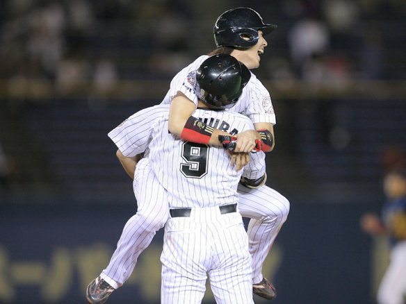試合を決めた福浦に真っ先に抱きつく西岡
