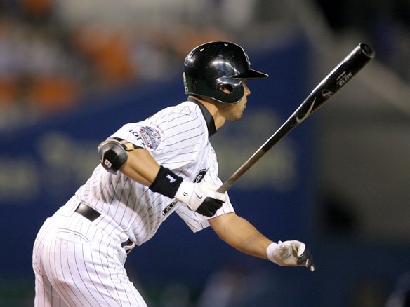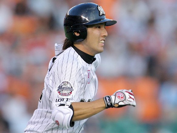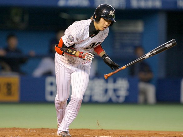 福浦が1,2塁間のど真ん中を破るヒットを放つ