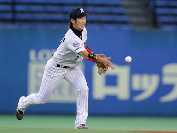 1番 坂口 一ゴ 初球、アウトコースの球を引っかけさせて、ファースト・福浦の正面へ打たせた! |