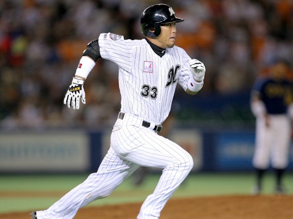 4番 サブロー 四球 0-3から2-3まで持ち込まれた6球目、高めに浮いた球を見送って押し出しのフォアボールを選ぶ!3塁ランナー・今江がホームイン!1対2。 ![]() 1