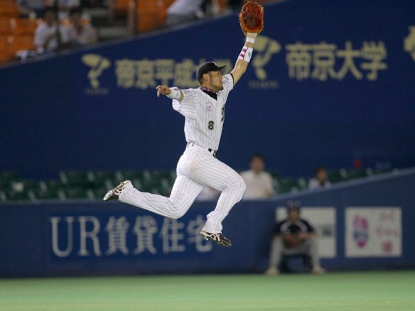 今江が懸命にジャンプするが打球はその上を越えてヒットに