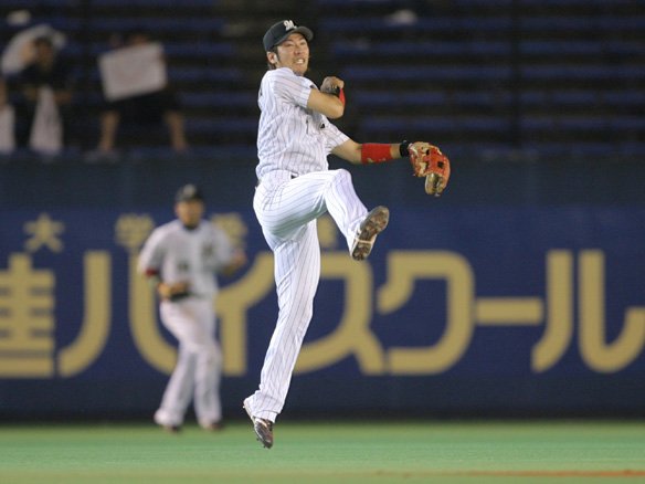 4番 ローズ 遊安 2-2からの5球目、低めの球をセンター返しされたが、あらかじめ2塁ベース寄りに守っていたショート・西岡が追い付き、ジャンピングスロー。しかし、間に合わず・・・。 |