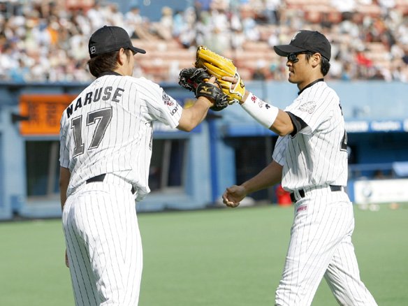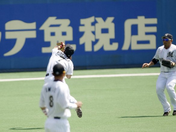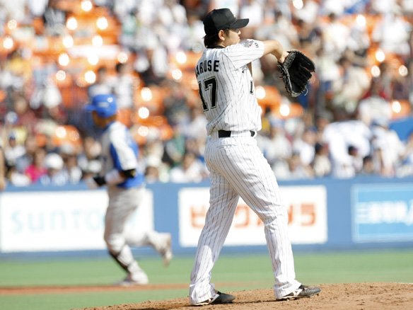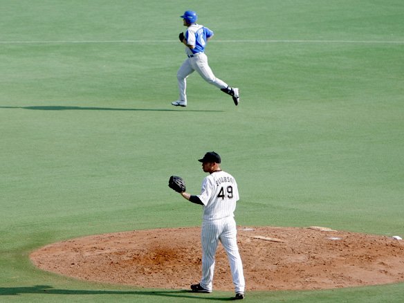 投手 成瀬 5番 G.G.佐藤 左飛 初球をすくい上げられたが、平凡なフライとなり、レフト・ベニーが下がって捕球! |