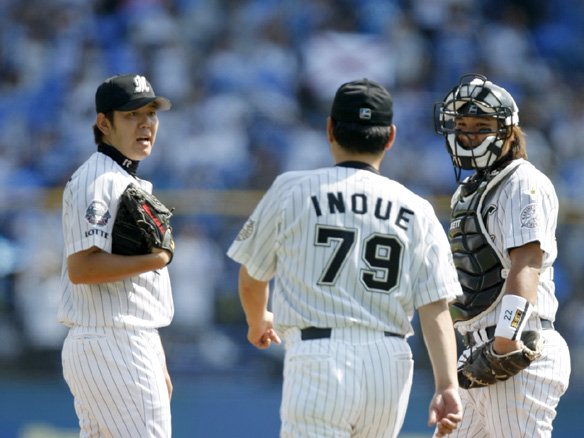 井上ピッチングコーチがマウンドに向かい、里崎も交えて打ち合わせ。 |