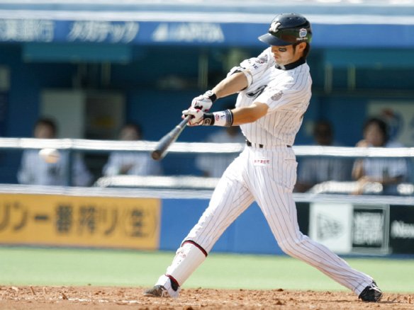 5番 G.G.佐藤 右翼二 2-1からアウトコースの球に逆らわずに弾き返され、ライト線際へ運ばれた・・・。 |