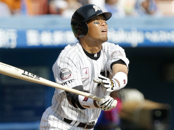 5番 G.G.佐藤 遊ゴ 初球を引っ張り損なった三遊間の打球。ショート・西岡が回り込んで押さえ、6-4-3のダブルプレーを狙ったが、1塁はセーフ・・・。 |