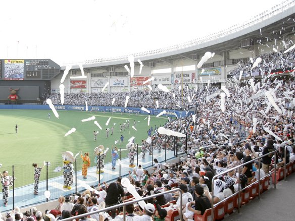 1番 西岡 中二 2-1からの6球目、アウトコース低めの球ををバットの先でうまく合わせ、右中間前へ落とした! センター・栗山が駆け込んで押さえたが弾き、2塁ランナー・今江に続き、1塁ランナー・早川がスライディングでホームイン!一気に逆転!5対4! 2塁に到達した西岡は両手を突き上げ、ガッツポーズ! ![]() 5