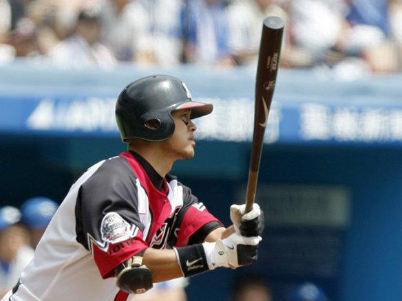 4番 里崎 右翼二 1-2から押っつけた痛烈な当たりは、ライト・G.G.佐藤の右を抜け、長打に! これで今季5度目の先発全員安打! |
