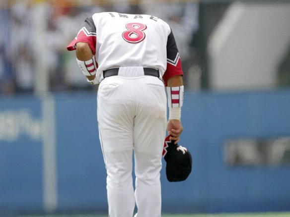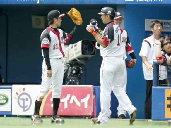 8番 今江 右犠飛 0-1から押っつけた打球は、犠牲フライには充分!ランナーそれぞれタッチアップから進塁し、3塁ランナー・サブロー、先制のホームイン!1対0。 ![]() 1