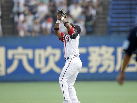 5番 G.G.佐藤 中飛 初球を打ち上げさせ、センターほぼ定位置へのフライ! |