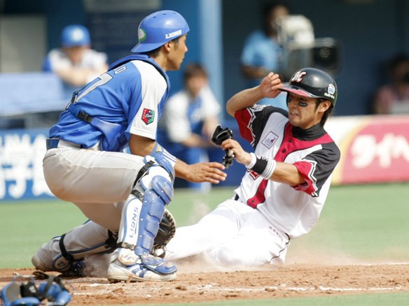 2番 根元 右中二 1-0から今度は引っ張り、右中間へと運んだ!駆け込んだライト・G.G.佐藤が送球しようとしてボールを落として、投げ遅れ、1塁ランナー・早川は3塁を蹴って一気に生還!10対0。 記録は2ベースヒットとライトのエラー。 |