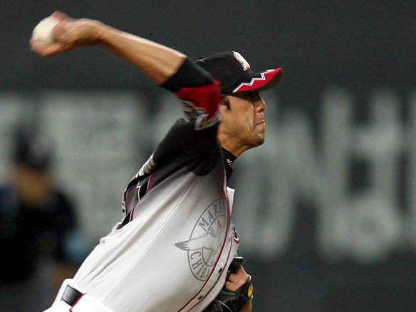 8番 鶴岡 捕バゴ バントの構えを見せ、初球はファール。2球目をキャッチャー前へ転がされたが、里崎が駆け込み、素早く2塁へ送球!1塁ランナー・小谷野、アウト。送りバント失敗。 2-6-3のダブルプレーを狙ったが、惜しくも1塁はセーフ。 |