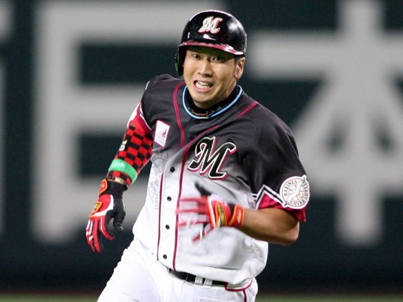 投手 ホールトン 1番 西岡 左中二 初球のストレートを狙っていった鋭い打球はセンターの左を破った!マリーンズいきなりの先制チャンス! |