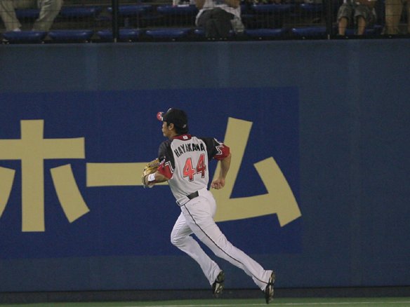 左中間の深い当たりを走り込んで捕球する早川の好プレー!