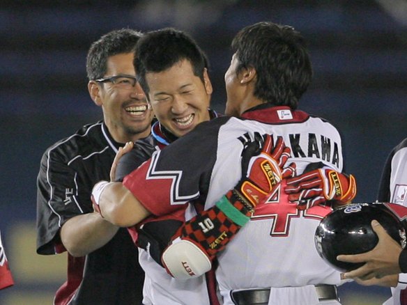 劇的なサヨナラ打を放ち、チームメイトの祝福を受ける大松