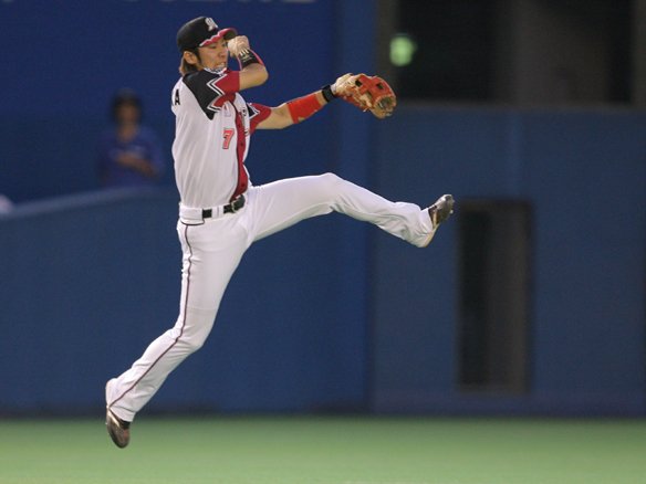 華麗なジャンピングスローで難しい打球を処理する西岡
