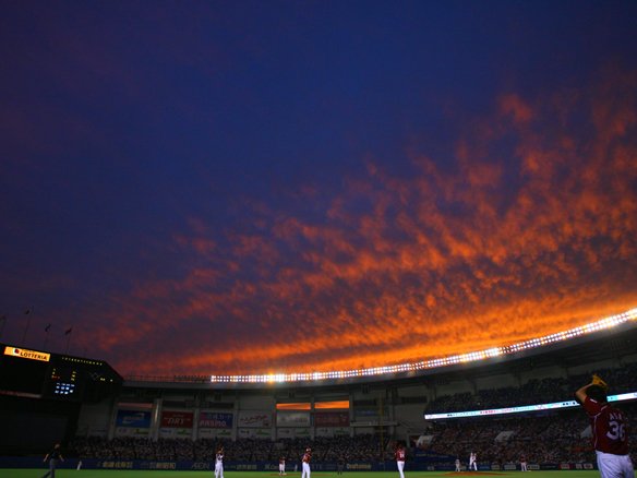 夕日で朱く染まるマリンスタジアム