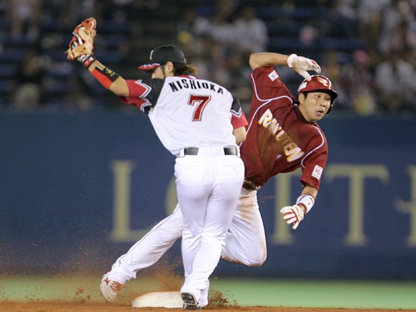 (東北楽天 2塁ランナー・渡辺直→代走・西村) |