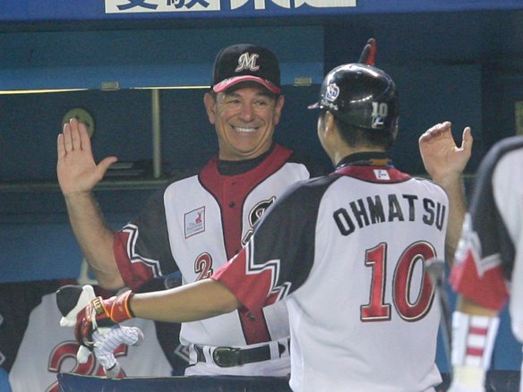 同点3ランHRを放ち、バレンタイン監督とハイタッチする大松