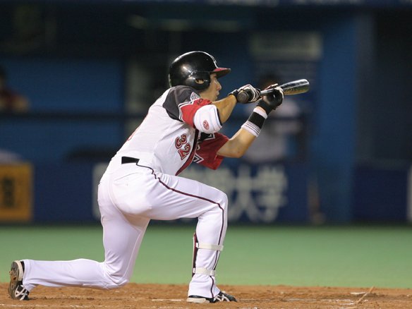 1番 福浦 中安 2-2からセンター返し!打球は突っ込んだセンター・鉄平の前に落ち、鉄平が打球を弾いたが、2塁へは進めず。 |