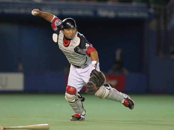 1塁へ送球する里崎