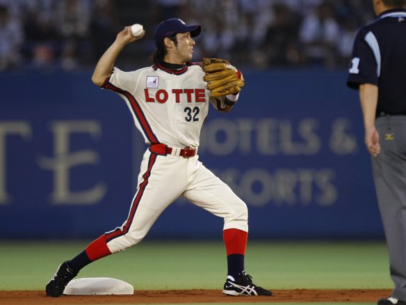 4番 セギノール 遊ゴ 1-2からの4球目、ピッチャー返しのゴロは久保のグラブを弾き、そのまま後ろに飛んだが、あらかじめ2塁ベース付近で守っていたショート・渡辺正がキャッチ。今度は落ち着いて1塁に転送! |