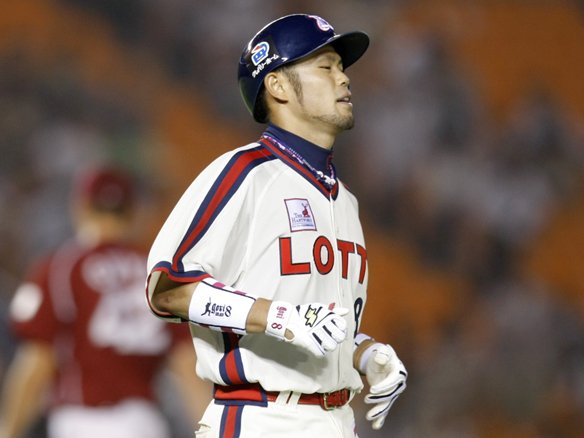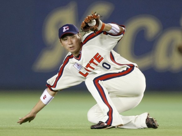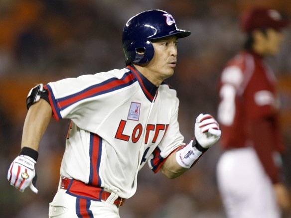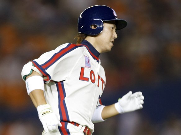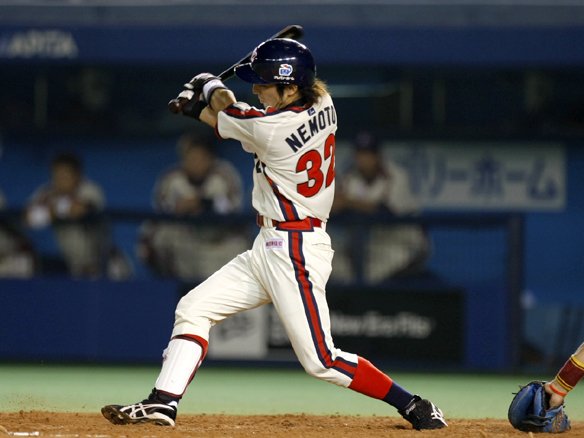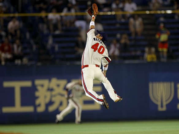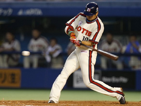 6番 今江 左翼二 初球、インコース低めに落ちるスライダーを上手くとらえて、サード・フェルナンデスの横を破って、フェンスに到達!今江はゆうゆうと2塁へ! |