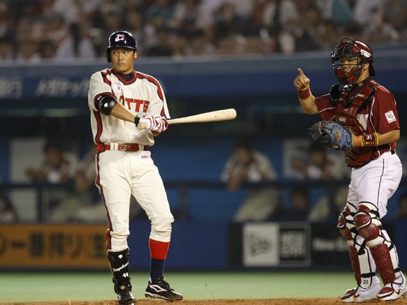 投手 岩隈 4番 サブロー 空三振 2-1からの4球目、アウトコース低めに落ちる変化球に手を出すも、バットが合わず・・・。 |
