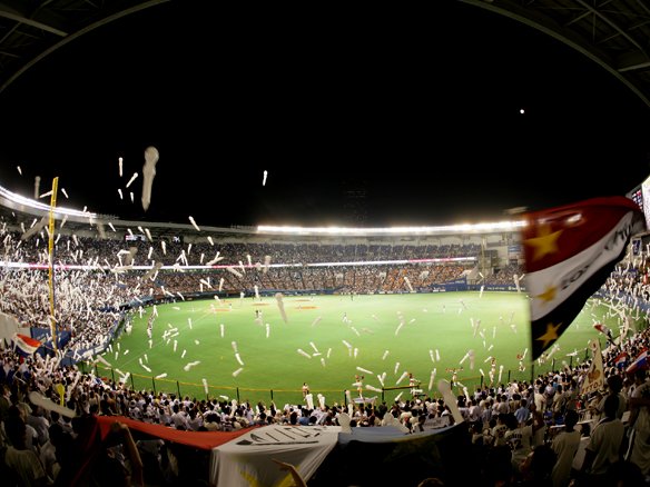 ラッキー7の攻撃でオリオンズの旗を振って応援するライトスタンド