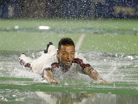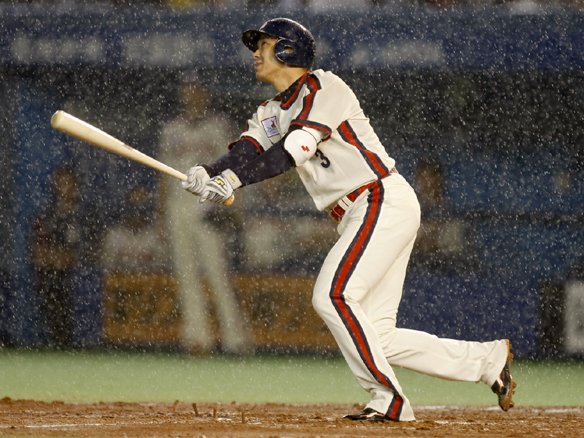 激しい雨の中、サブローの打った打球はレフトフライに倒れる